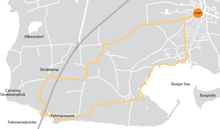 Los geht’s an der Kirche St. Nikolai in Burg auf dem Radweg Richtung Burgstaaken. Von dort weiter auf dem Deichkronenweg mit toller Aussicht auf den Burger Binnensee nach Wulfen. Auf kleinen Feldwegen erreichen wir Fehmarnsund mit seinem tollen Naturstrand. Unter der Sundbrücke hindurch fahren wir weiter bis zum Campingplatz Strukkamphuk. Wer abends losfährt, kann hier von der Strandbar aus einen tollen Sonnenuntergang erleben. Anschließend geht es über Strukkamp und Avendorf zurück.